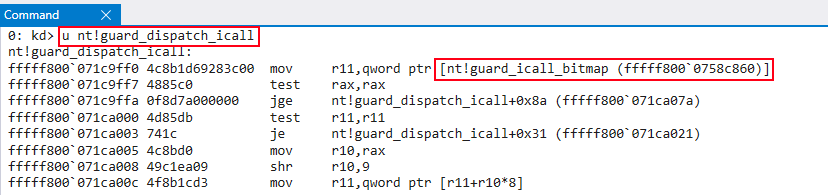 kCFG uses a slightly different modification of CFG, in that the bitmap is stored inside the variable nt!guard_icall_bitmap. Additionally, nt!_guard_dispatch_icall