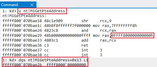 . However, after Windows 10 1607 (RS1), the base of the PTEs were randomized — meaning this process is now not so trivial. One of the ways to bring back the “trivial” method of calculating the PTE for a given virtual address is to derandomize the base of the PTEs. The Windows API exposes a function called nt!MiGetPteAddress