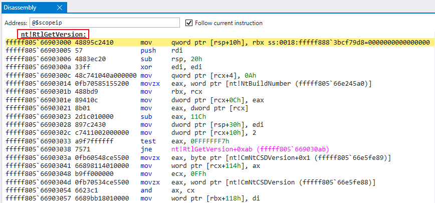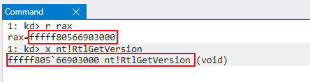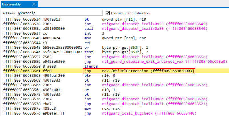 Just before reaching execution, the kCFG bitmap takes in the value of RAX, which will be nt!RtlGetVersion