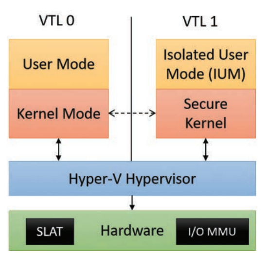 In order to provide additional security boundaries for the Windows OS, Microsoft opted to utilize the existing virtualization capabilities of modern hardware. Among these mitigations are Hypervisor-Protected Code Integrity (HVCI) and Virtualization-Based Security (VBS). VBS is responsible for enabling HVCI and is enabled by default on compatible hardware after Windows 10 1903 (19H1) on “Secured Core” systems. It can also be turned on by default on Windows 10 2003 (20H1) systems for vendors that opt-in through system configuration, and if the hardware is modern enough to conform to Microsoft’s “Security Level 3” baseline. VBS aims to isolate user-mode and kernel-mode code by having it run on top of the Hyper-V Hypervisor. The following image from Windows Internals, Part 1, 7th Edition (Ionescu, et al.) outlines a high-level visual into the implementation of VBS.