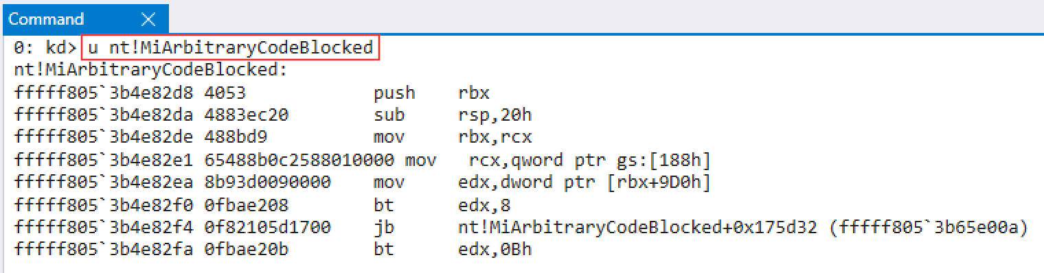 . ACG, although a user-mode mitigation, is implemented in the kernel through a Windows API function called nt!MiArbitraryCodeBlocked