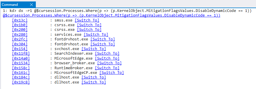 failure is returned from the function check, resulting in a crash. Additionally, it is possible to obtain a list of all running processes that have ACG enabled, by parsing all of the EPROCESS objects.