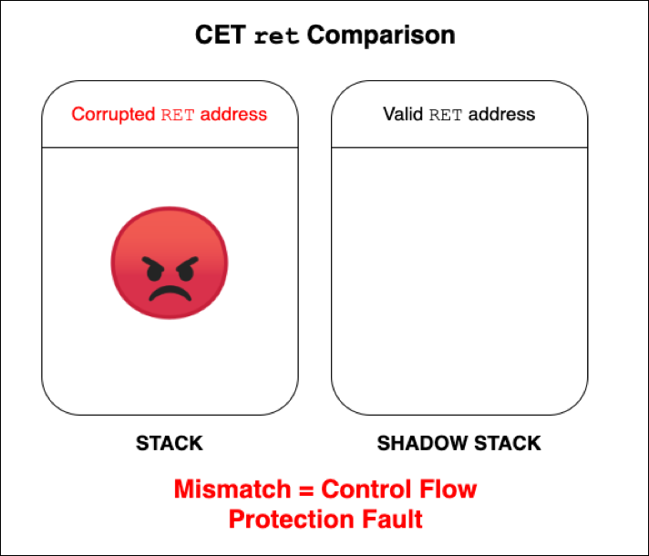 Due to CFG not taking into account return edge cases, Microsoft needed to quickly develop a solution to protect return addresses. As mentioned by Joe Bialek of the Microsoft Security Response Center in his OffensiveCon 2018 talk, Microsoft initially addressed this problem with a software-based mitigation known as RFG, or Return Flow Guard. RFG aimed to address the problem by utilizing additional code in function prologues to push the return address of a function onto something known as a “shadow stack,” which contains only copies of the legitimate return pointers for functions and does not hold any parameters. This shadow stack was not accessible from user mode and therefore “protected by the kernel.” In the epilogue of a function, the shadow stack’s copy of the return address was compared to the in-scope return address. If they were different, a crash would ensue. RFG, although a nice concept, was eventually defeated by Microsoft’s internal red team, which found a universal bypass that came down to the implementation of any shadow stack solution implemented in software. Due to the limitations of any software implementation of control-flow hijacking, a hardware-based solution was needed. Enter Intel CET or Control-Flow Enforcement Technology. CET is a hardware-based mitigation that implements a shadow stack to protect return addresses on the stack, as well as forward edge cases such as calls/jumps through Indirect Branch Tracking (IBT). However, Microsoft has opted to use CFG (and XFG, which will be referenced later within this post) to protect forward edge cases instead of CET’s IBT capabilities, which works similarly to Clang’s CFI implementation, according to Alex Ionescu and Yarden Shafir. CET’s main talking point is its protection of return addresses, essentially thwarting ROP. CET has a similar approach to RFG, in that a shadow stack is used.