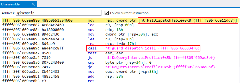 Xtended Control Flow Guard, popularized as XFG, is Microsoft’s “enhanced” implementation of CFG. By design, CFG only validates if functions exist in the CFG bitmap — meaning that technically if a function pointer was overwritten by another function that existed in the CFG bitmap, it would be a valid target. Figure 8 below shows , which normally points to hal!HaliQuerySystemInformation