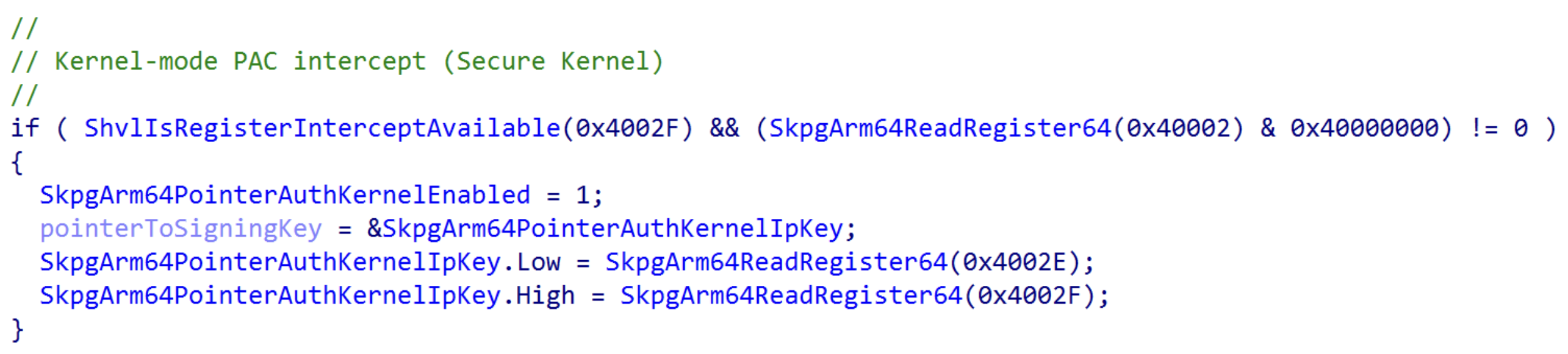 Although ARM-based hypervisors do not have “Virtual Machine Control Structure”, or VMCS (in the “canonical” sense that x86-based systems do, such as having dedicated instructions in the ISA for reading/writing to the VMCS), ARM hypervisors still must maintain the “state” of a guest. This, obviously, is used in situations like when a processor starts executing in context of the hypervisor software (due to a hypervisor call (HVC call), or other exceptions into the hypervisor), or when a guest starts resuming its execution. Part of this state - as is the case with x86-based systems - is the set of virtual registers (e.g., registers which are preserved across exception level changes into/out of the hypervisor and are specific to a guest). Among the virtual registers which are configurable by the hypervisor are, as you may have guessed, the “lo” and “hi” PAC signing key registers! This is what the function from the screenshot above intends to achieve - securekernel!SkpgArm64ReadRegister64. Microsoft documents many of the 64-bit virtualized-registers. Among the undocumented registers, however, are the ARM-based virtualized registers. However, we can see above that values 0x4002E and 0x4002F correspond to the virtual/private PAC signing registers. For completeness sake, 0x40002 corresponds to SCTLR_EL1. This was determined by examining the bit being processed (bit 30, via the 0x40000000 mask). This was previously seen, in the beginning of our analysis, by the toggling of SCTLR_EL1.EnIB bit (bit 30).