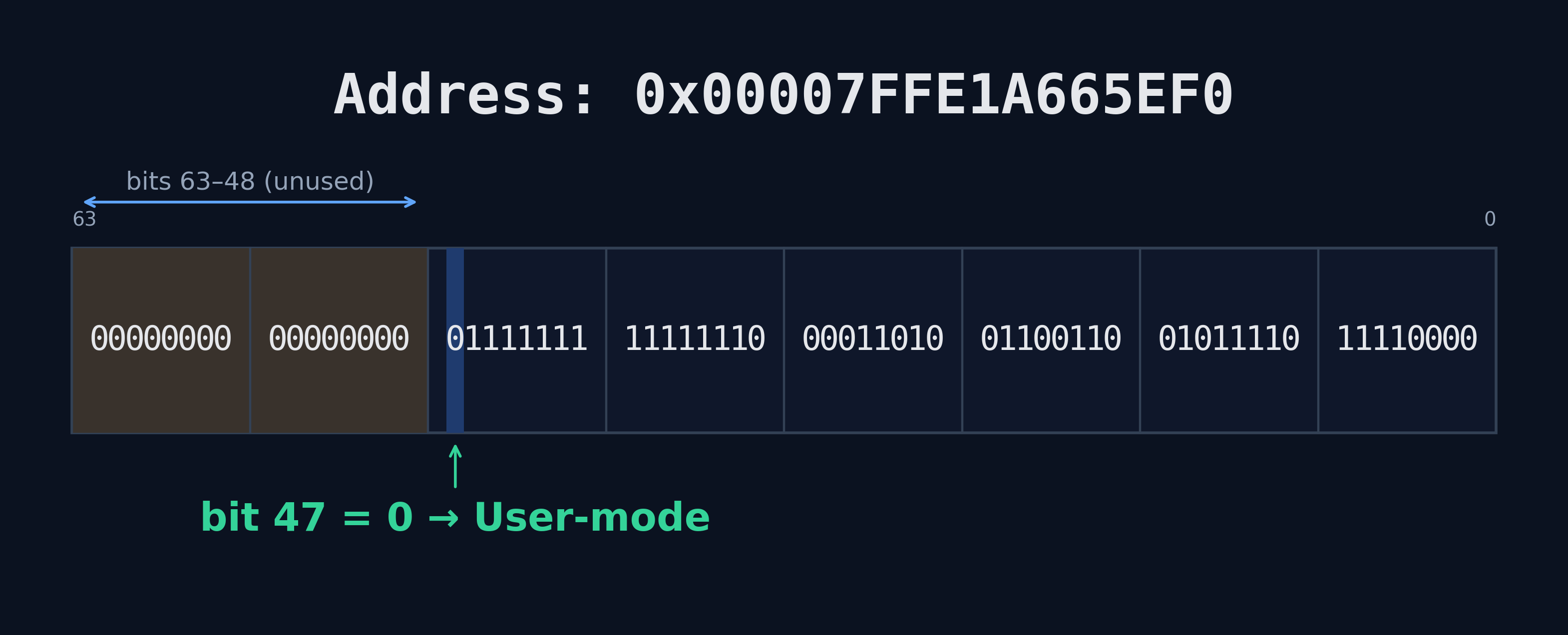 On a typical 64-bit processor a pointer is considered a “user-mode” pointer if bit 47 of a 64-bit address is set to 0 (meaning, then, bits 48-63 are also 0). This is known as a canonical user-mode address. If bit 47 is set to 1, bits 48-63 are also set to 1, with this being considered a canonical kernel-mode address. Additionally, LA57, ARM 52 or 56 bit, or similar processors extend the most significant bit out even further (and PAC can also be enabled in the ARM-specific scenarios). For our purposes, however, we will be looking at a typical 64-bit processor with the most significant bit being bit 47.