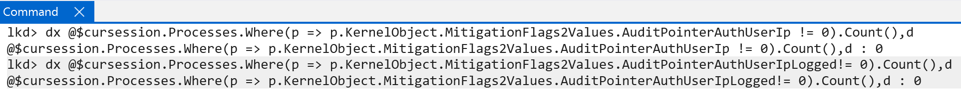 policy map. This can be confirmed through the presence of the mitigation flag values of AuditPointerAuthUserIp