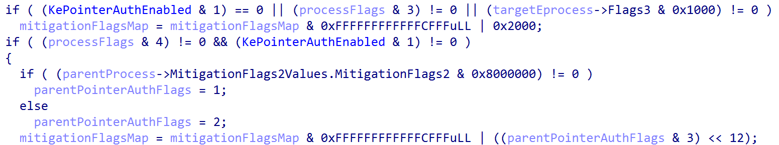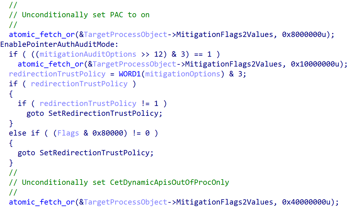 However, testing and reverse engineering revealed that PAC is unconditionally enabled on user-mode processes (as shown above) with no way to disable the mitigation either at process creation (e.g., creating a child process with extended parameters) or by calling SetProcessMitigationPolicy