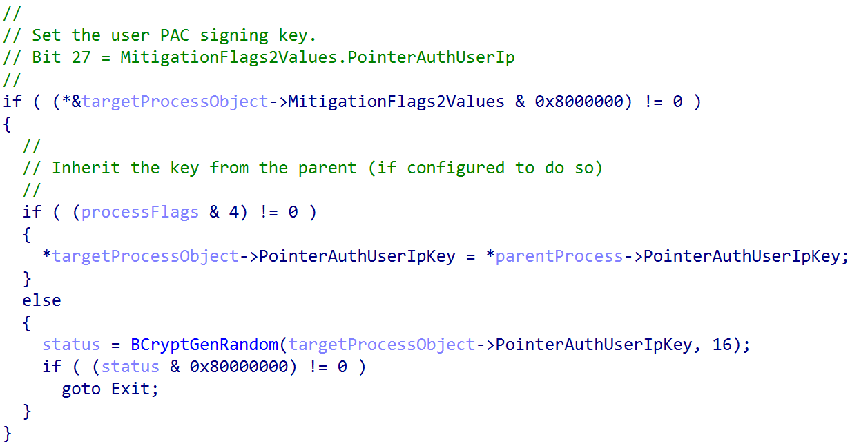 Once the appropriate PAC-related initialization flags have been set, PAC is then enabled on a per-process basis (if per-process PAC is supported, which currently on Windows it is). For user-mode PAC, the enablement process begins at process creation, specifically during the allocation of the new process object. If PAC is enabled, each user-mode process (meaning EPROCESS->Flags3.SystemProcess