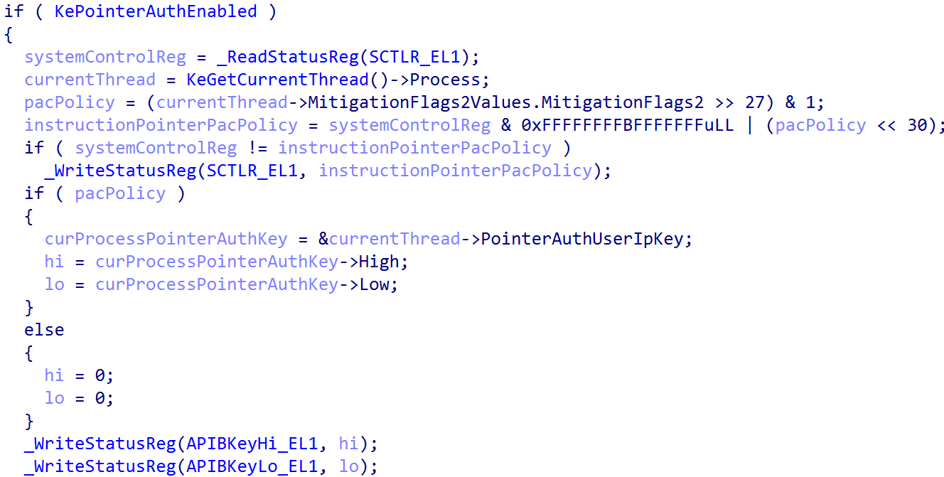 . This is because, obviously, execution is in kernel mode when the initial signing key is instantiated. However, the implementation of PAC on Windows (as we can see above) instruments a per-process signing key (along with a single kernel key). When execution transitions into user mode, the signing key system register(s) are updated to the current process signing key (which is maintained through a process object). The example below outlines the current PAC signing key being updated to that of a user-mode process, specifically when a return into user-mode happens after a system call is handled by the kernel (KiSystemServiceExit