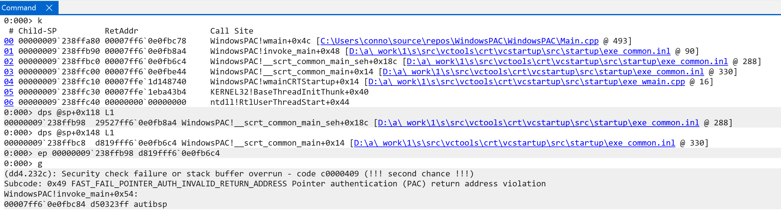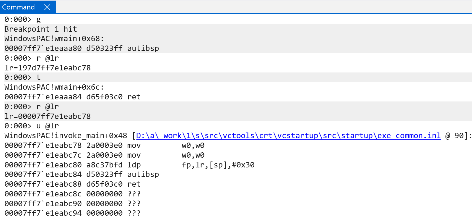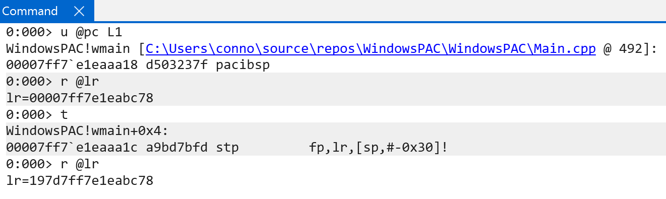Windows currently offers an implementation of PAC (with the ability to expand in the future). Windows currently supports PAC for signing and authenticating “instruction pointers”. The way that this manifests itself, however, really results in the signing of return addresses. On Windows, for both user-mode and kernel-mode ARM64 code, one can specify the /guard:signret(-)