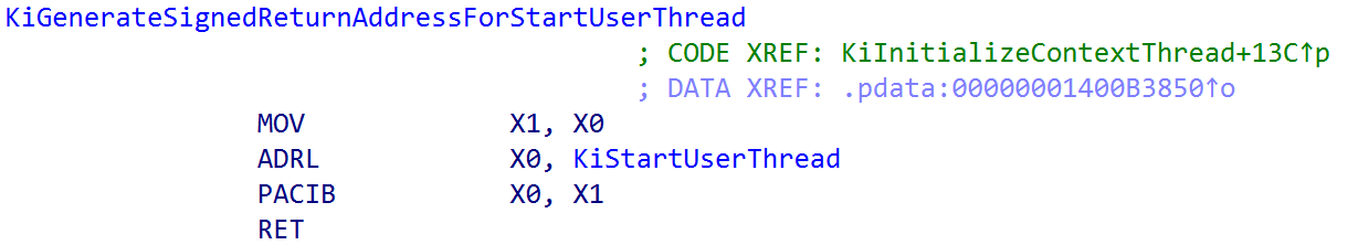 This assumes, however, that there is already a return address to process. What if a user-mode thread, for example, is just entering its initial execution, and there is no return address? Windows has two functions (for user-mode and kernel-mode) that will generate the necessary “first” signed return address via KiGenerateSignedReturnAddressForStartUserThread