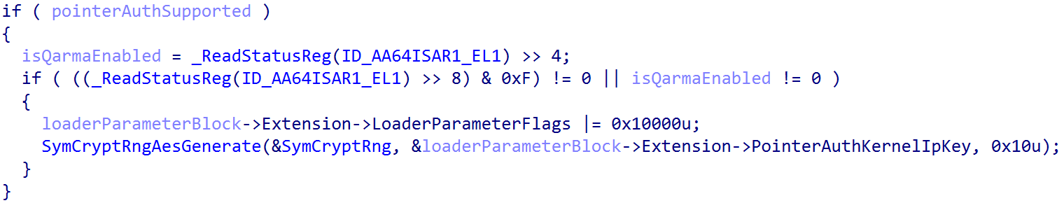 The ARM architecture supports having multiple signing keys for different scenarios, like signing instruction pointers or data pointers with different keys. Typically, “key A” and “key B” (as they are referred to), which are stored in specific system registers, are used for signing pointers used in instruction executions (like return addresses). Windows currently only uses PAC for “instruction pointers” (more on this later) and it also it only uses “key B” for cryptographic signatures and, therefore, loads the target pointer signing value into the APIBKeyLo_EL1