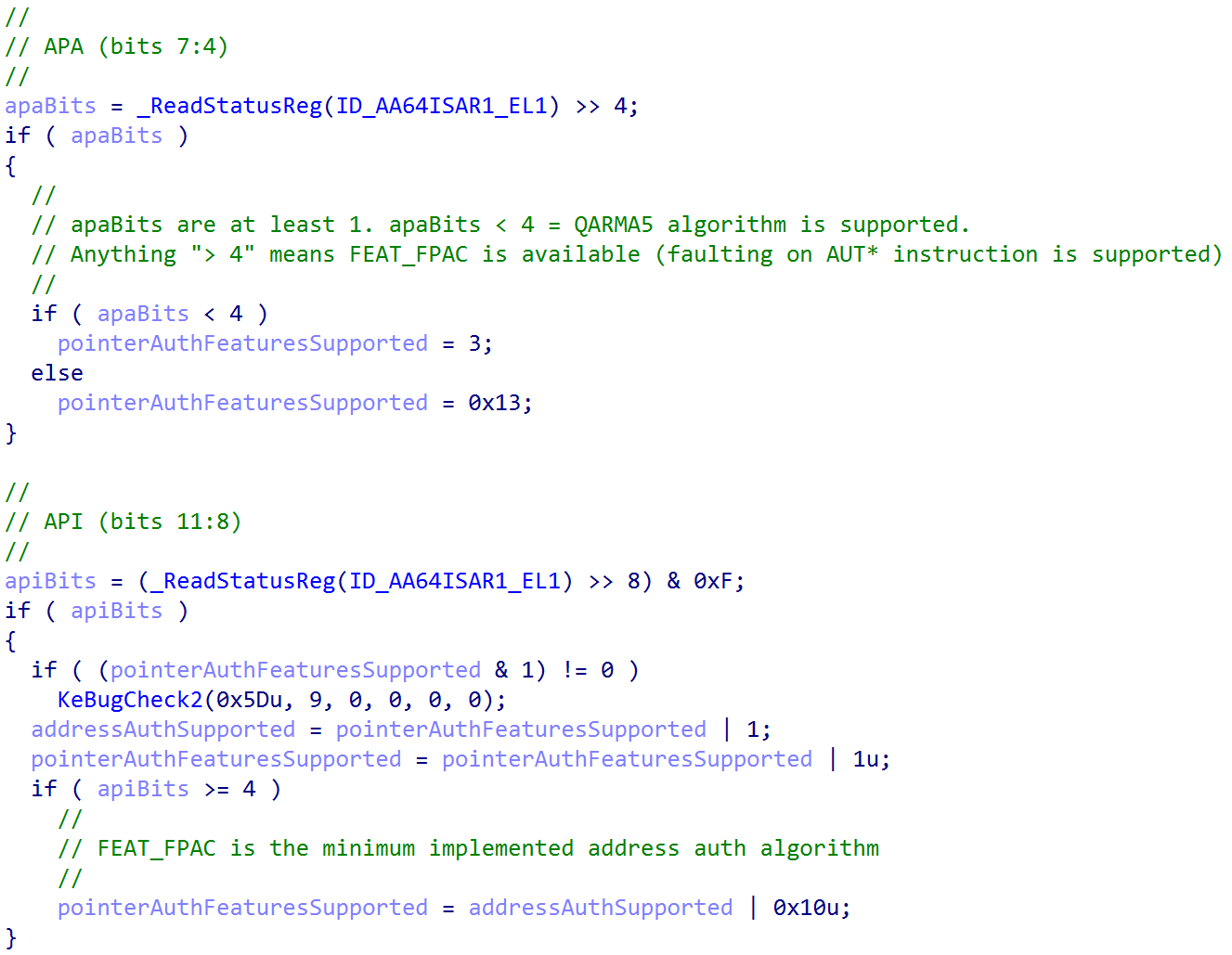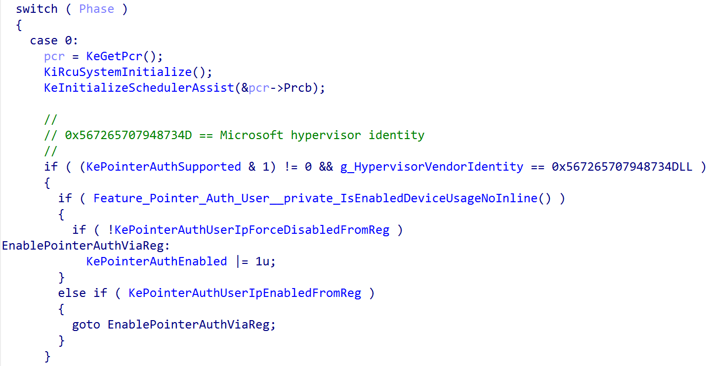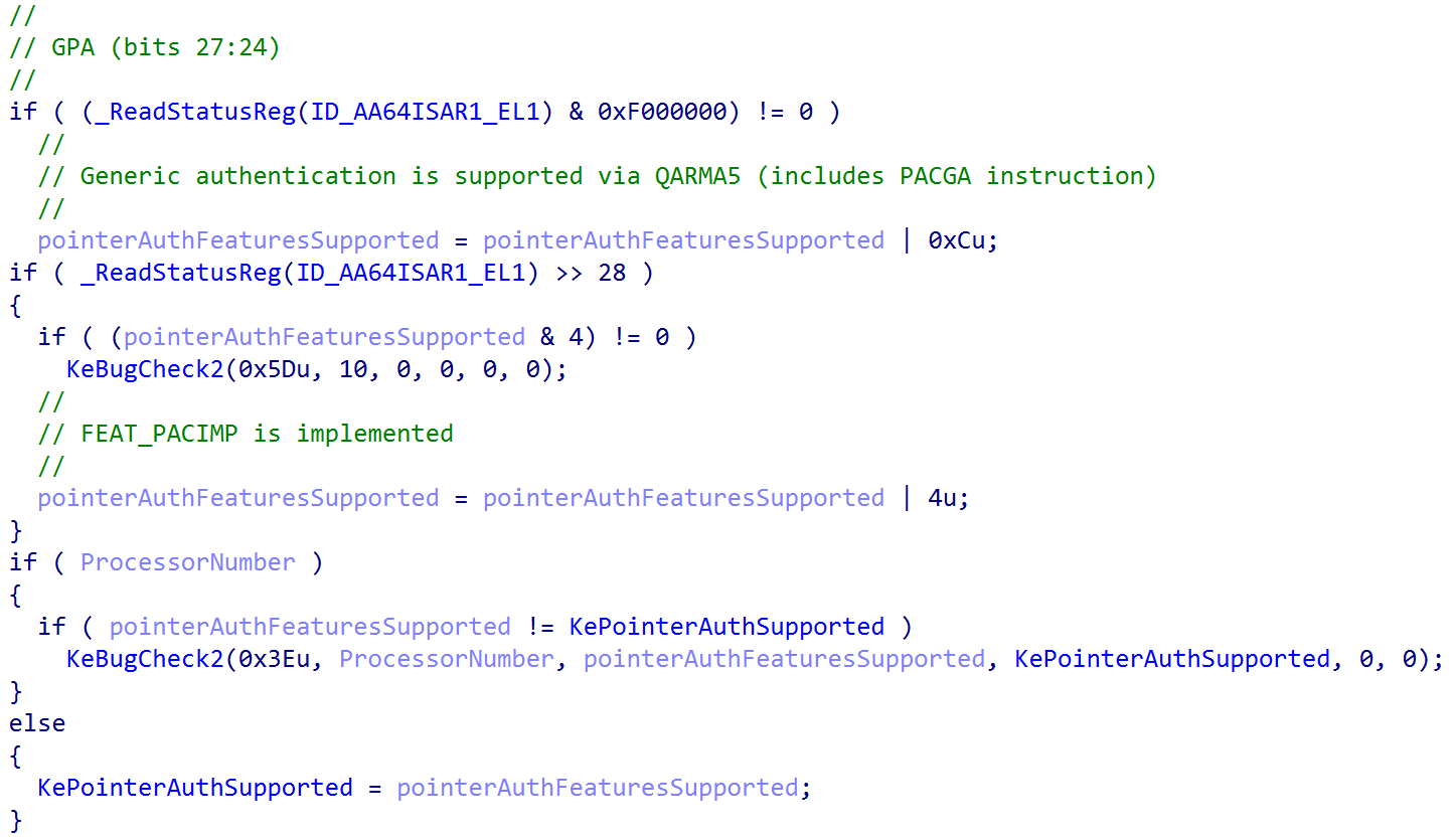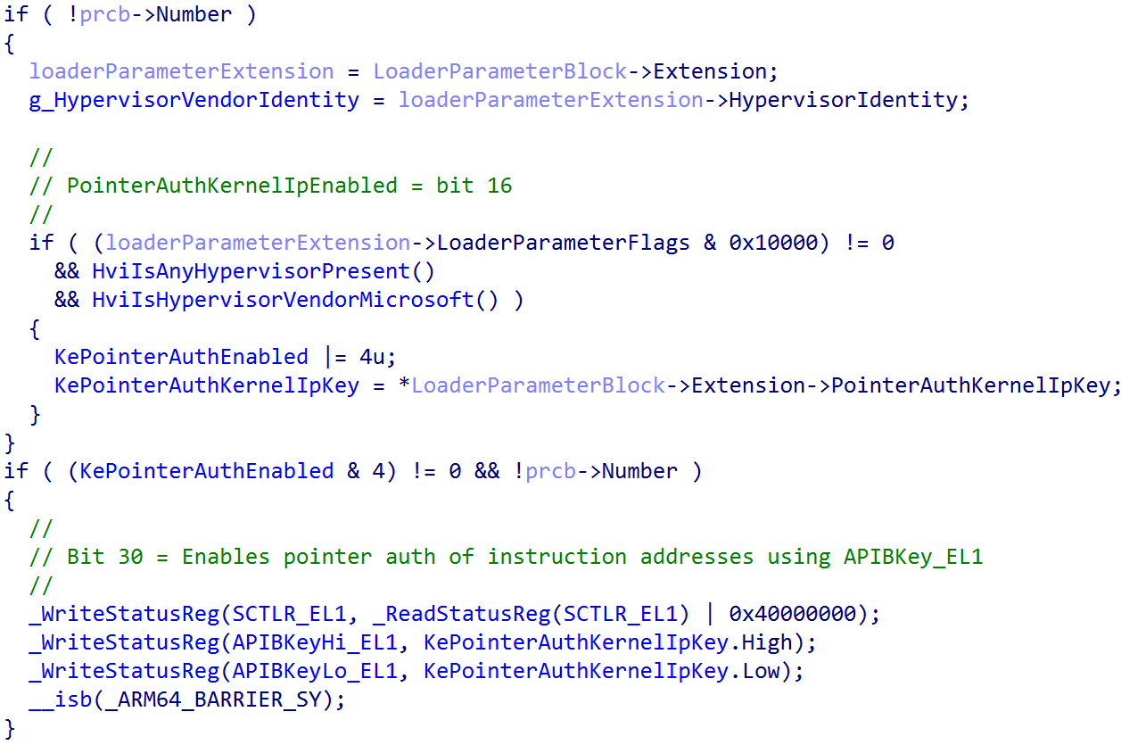 is called from the kernel entry point, which also receives the loader parameter block and initializes various items such as the feature settings bitmask, setting the proper stack sizes (especially for “special” stacks like ISR stacks and DPC stacks), etc. One of those crucial things that this function does is call into KiDetectPointerAuthSupport
