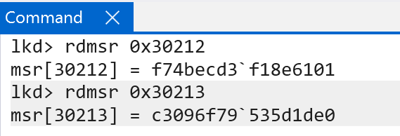 It is possible to examine the current signing key values using WinDbg. Although WinDbg, on ARM systems, has no extension to read from these system registers, it was discovered through trial-and-error that it is possible to leverage the rdmsr