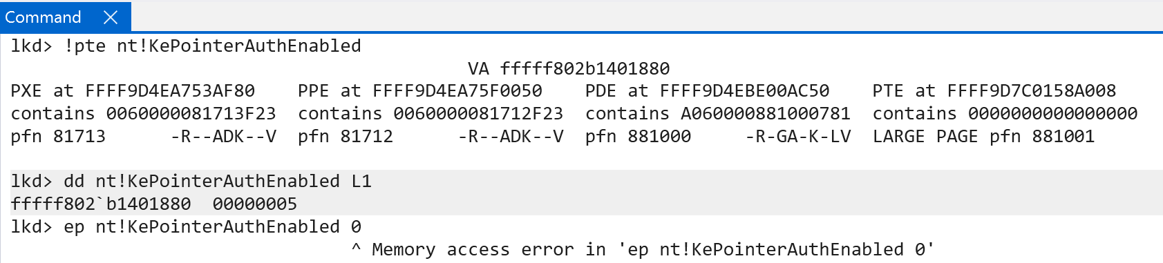 . As seen below, even using WinDbg, it is impossible to overwrite these global variables as they are read-only in the “Stage 2” page tables.